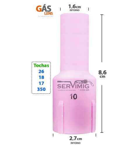 | Características | Bocal Ceramico Gas Lens Longo Tig nº 10 A função do bocal tig é ajudar a direcionar o gas argonio, diretamente sobre a peça soldada. Para utilizar o bocal Longo lens, é necessário do porta bico / difusor e do isolador gas lens também. Este modelo é o bocal longo gas lens tig n10 - 8,6 cm de comprimento |