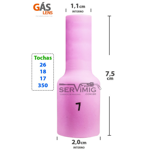 | Características | Bocal Ceramico Gas Lens Longo Tig nº 7 A função do bocal tig é ajudar a direcionar o gas argonio, diretamente sobre a peça soldada. Para utilizar o bocal Longo lens, é necessário do porta bico / difusor e do isolador gas lens também. Este modelo é o bocal longo gas lens tig n7 - 7,5 cm de comprimento |
