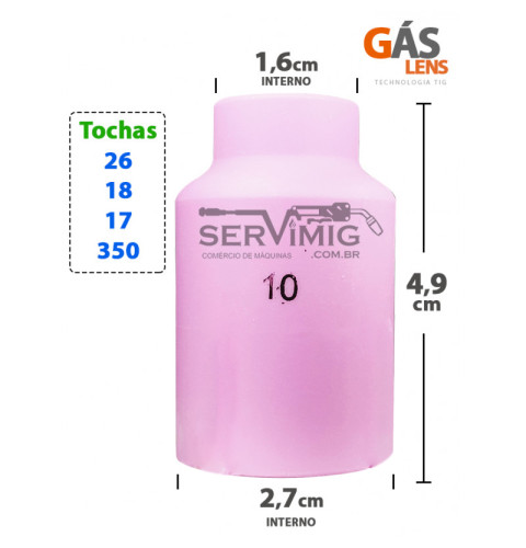 | Características | Bocal Ceramico Gas Lens Tig nº 10 A função do bocal tig é ajudar a direcionar o gas argonio, diretamente sobre a peça soldada. Para utilizar o bocal gas lens, é necessário do porta bico / difusor grande e do isolador grande gas lens também. Este modelo é o bocal gas lens tig n10 - 4,9 cm de comprimento |
