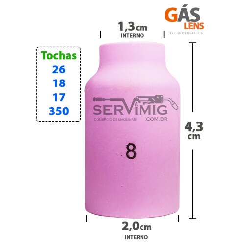 | Características | Bocal Ceramico Gas Lens Tig nº 8 A função do bocal tig é ajudar a direcionar o gas argonio, diretamente sobre a peça soldada. Para utilizar o bocal gas lens, é necessário do porta bico / difusor e do isolador gas lens também. Este modelo é o bocal gas lens tig n8 - 4,3 cm de comprimento |