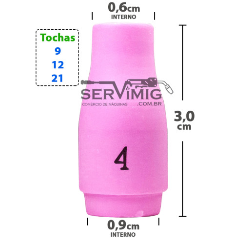 O bocal ceramico tig nº 4 , tem 3 cm de comprimento e 0,9 cm de medida interna da base