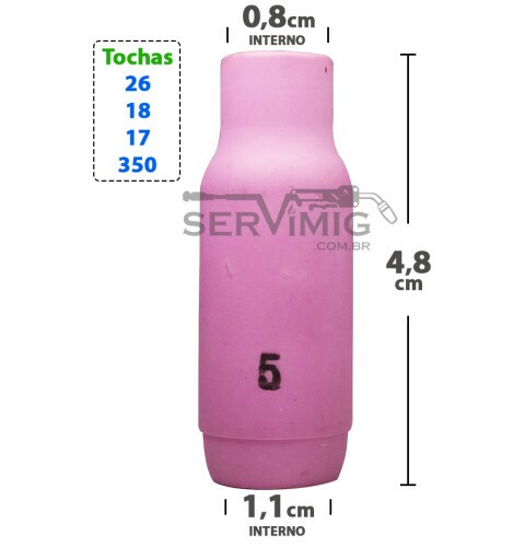 | Características | Bocal Ceramico Tig nº 5 Tem como objetivo ajudar na distribuição da saida do gás e na proteção do eletrodo tungstenio, envitanto que o mesmo se contamine com as impurezas da solda. O bocal ceramico tig nº 5 , tem 4,8 cm de comprimento e 1,1 cm de medida interna da base Este bocal tig 5 é compativel com diversas tochas no mercado, como a tocha tig 26 - 17 - 18 - 350 |