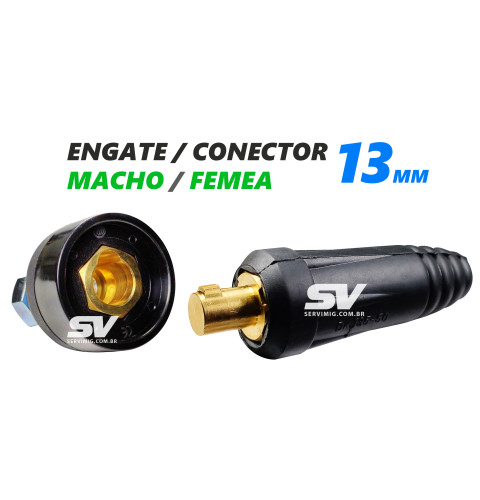 | Características | Conector ou Engate Rapido Macho e Femea 13mm O engate rapido femea é utilizado no painel da maquina. O conjunto é utilizado para conectar o engate macho 13mm do cabo de solda, direto no painel da maquina femea de 13mm |