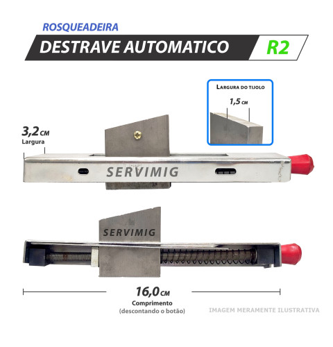 | Características | Destrave Automatico para Rosqueadeira R2 O destrave trabalha em conjunto com o cabeçote automatico, tem a função de destravar o cabeçote no final da rosca e ajustar o comprimento da rosca. Este modelo serve para diversas marcas no mercado, vefique as dimensões nas fotos. Marca: Servimig Aplicação: Rosqueadeira Re2 Comprimento: 16 cm Largura: 3,2 cm Bloco: 1,5 cm Rosqueadeira: Tander, Servimig, Br motors, etc |