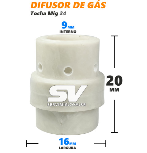 | Características | Difusor de gas utilizado em tocha processo mig modelo: Plus - MB 24, entre outras |