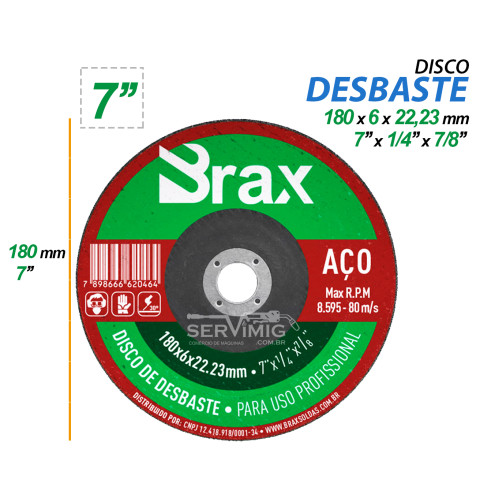 | Características | Disco Desbaste - 7'' - 180 x 6 x 22,23mm Medida: 180 x 6 x 22,23mm Medida: 7” x 1/4” x 7/8” pol Indicado para desbastes em metais ferrosos com esmerilhadeiras angulares. Esse modelo pode ser utilizado com rotação maxima de até 8595 RPM |