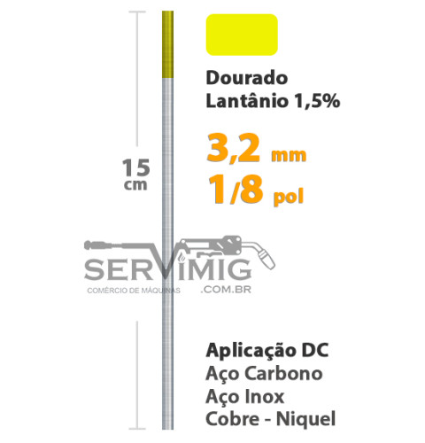| Características | Eletrodo Tungstênio Dourado - Lantanio 1,5% O eletrodo tungstenio é univerval e utilizado em todas as tochas tig |