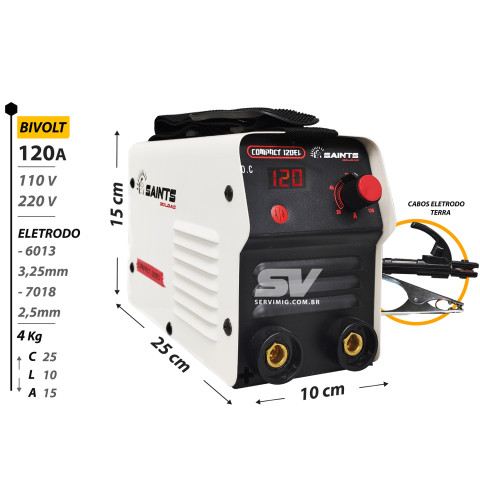 | Características | Inversora Solda Tig / Eletrodo Saints 120a Equipamento leve, portatil, possui amperimetro digital Capacidade de derretimento do eletrodo revestido 6013 - 3,25mm / 7018 - 2,5mm Modelo utilizado para pequenos serviços e não produção. |