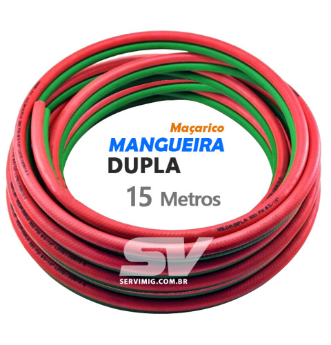 | Características | Mangueria Dupla 15 metros para Maçarico A mangueira dupla pode ser utilizada em processo de aquecimento ou corte. Suporte gases como acetileno, oxigenio e glp |