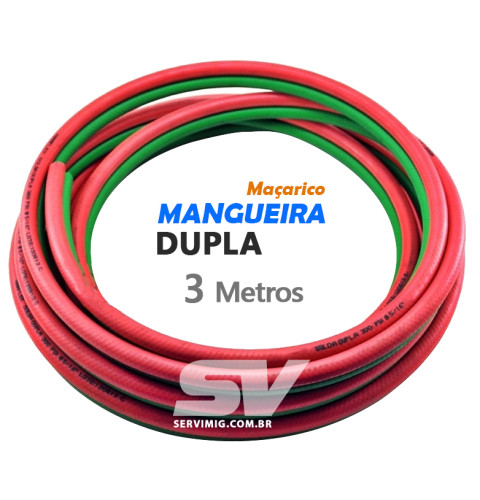 | Características | Mangueria Dupla 3 metros para Maçarico A mangueira dupla pode ser utilizada em processo de aquecimento ou corte. Suporte gases como acetileno, oxigenio e glp |