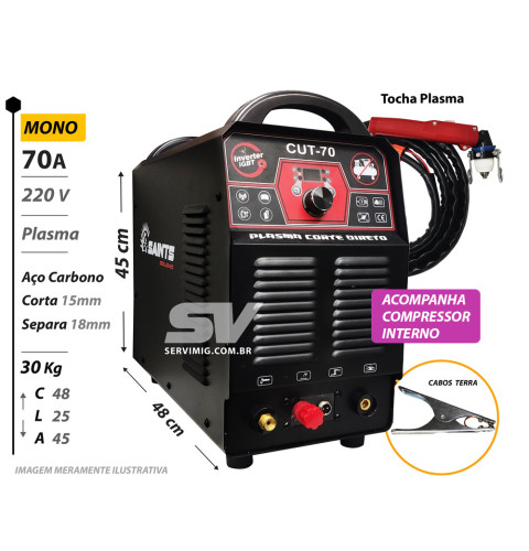 | Características | Maquina de Corte Plasma Saints 70A Através de um ar comprimido e um arco elétrico é possivel cortar ou separar esses chapas. Esse plasma tem amperagem maxima de 70A, |