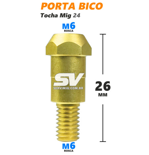 | Características | Porta Bico M6 utilizado em tocha processo mig modelo: Plus - MB 24, entre outras |