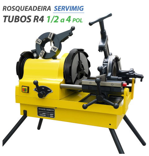 Rosqueadeira Elétrica de Tubos 1/2" à 4'" polegadas é uma máquina robusta para serviço pesado, com carcaça confeccionada em alumínio fundido de alta resistência. Provida de mandril com garras auto-blocantes e desarme automático de fim de rosca. Duas velocidades para rosca. Lubrificação automática sobre a rosca com óleo rosca/corte através do cabeçote, prolongando a vida útil dos cossinetes. Botão de ajuste de fluxo de óleo. Corta, escareia e rosqueia tubos de ½" à 4" em roscas BSPT e NPT